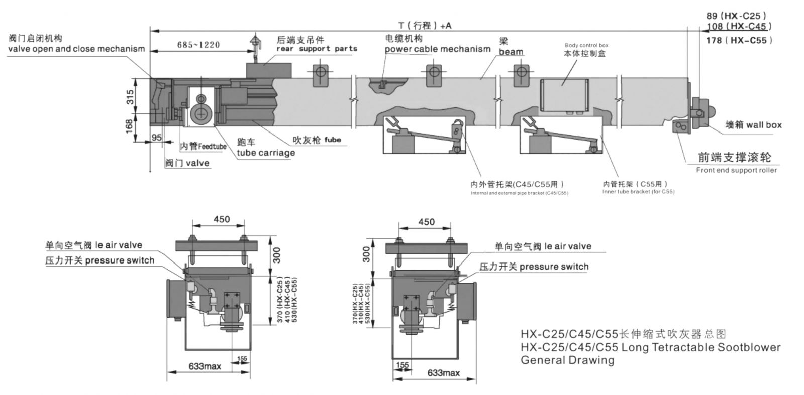 HX-C25/C45/C55吹灰器主要由跑車、提升閥、梁體、墻箱、動(dòng)力電纜、前端支撐滾輪、內(nèi)管、吹灰槍與噴頭、電氣箱與行程控制、螺旋線相變機(jī)構(gòu)選用)內(nèi)外管輔助托架、內(nèi)管托架等組成。